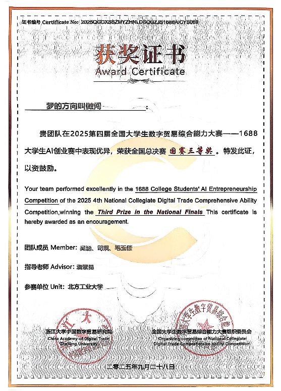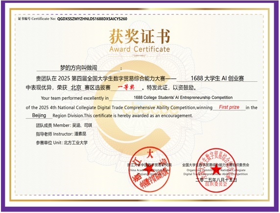 近日由浙江大学中国数字贸易研究院主办、全国大学生数字贸易综合技能大赛组织委员会承办的第四届全国大学生数字贸易综合技能大赛总决赛在浙江大学圆满落幕。我校学生吴涵、司琪、毛玉佳组成的代表队获得北京赛区一等奖、全国总决赛三等奖。