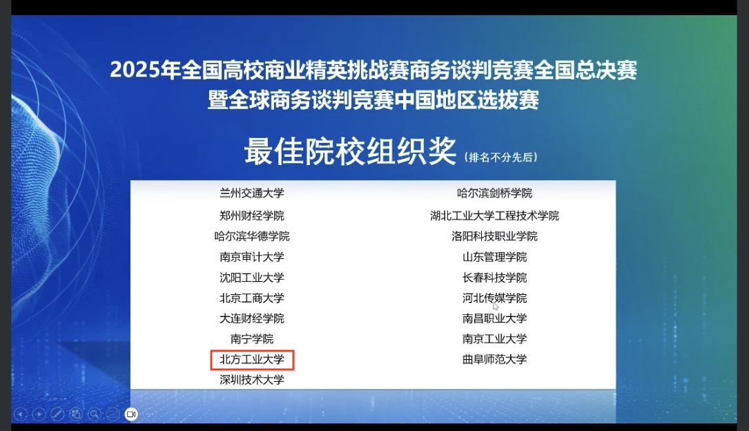 11月2日,2025年全国高校商业精英挑战赛商务谈判竞赛暨全球商务谈判竞赛中国地区选拔赛在线上圆满落幕。竞赛分为知识赛、全国预选赛、全国总决赛、全国精英赛四个阶段。我校在全国总决赛中获得一等奖4项,二等奖2项,三等奖2项,最佳院校组织奖。两支队伍进入精英赛(全国仅十支队伍),最终“锐谈先锋队”获得精英赛亚军。