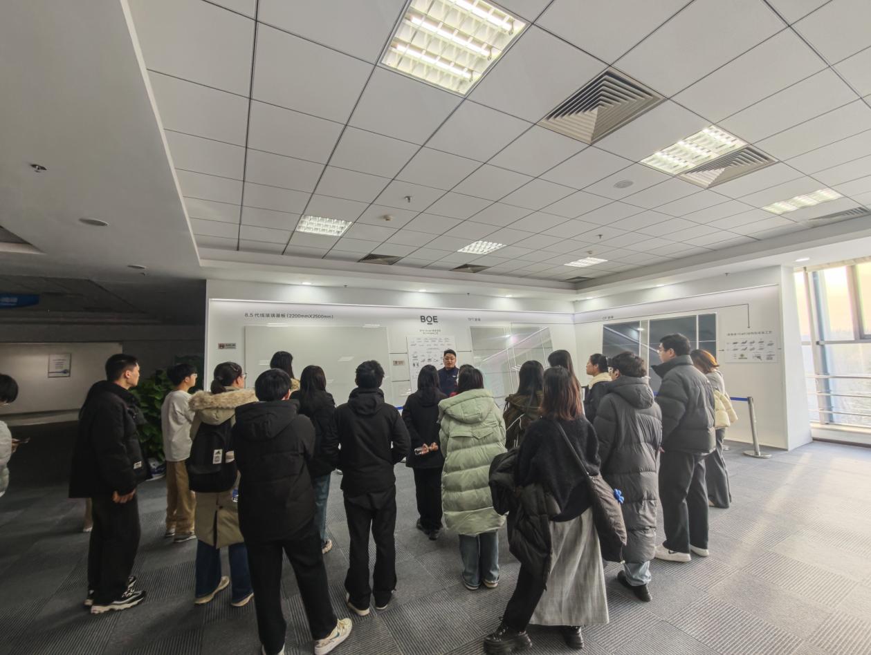 随后,师生前往位于总部附近的京东方智能化生产基地。技术负责人详细解析了液晶显示核心的四大工艺环节——阵列(Array)基板结构和1+4mask工艺、彩膜(CF)基板结构和工艺、液晶盒(Cell)结构和成盒工艺以及模组工艺(Module),并引导师生实地观摩全自动化无尘车间。
